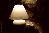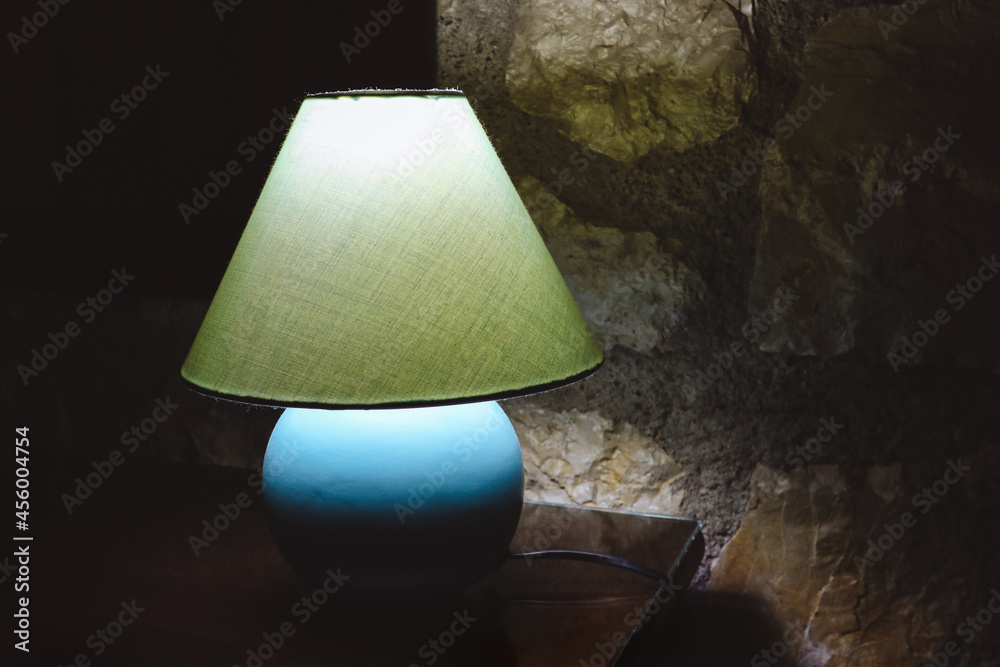 Bedside night illuminated lampshade light lamp with round blue base near stone wall in dark room. Interior design elements stylish background