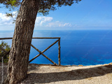 Egremni Beach Panorama observation deck with pine tree. Sunny view on sea turquoise water and scenic blue sky, Lefkada island, Ionian sea coast, Greece