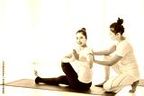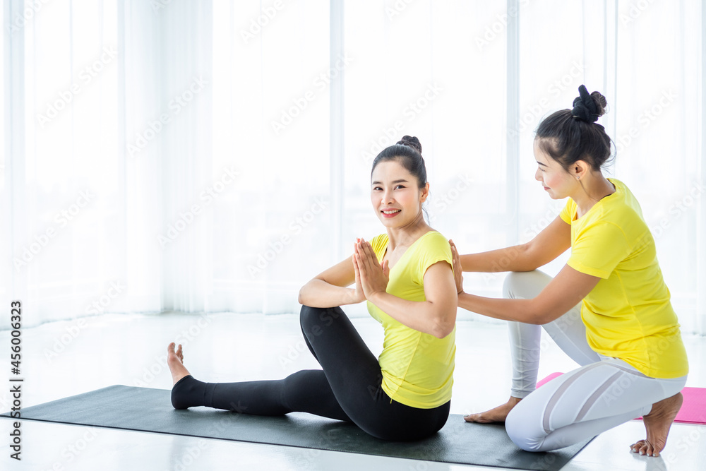 Two young Asian women workout practicing yoga in yellow dress or pose with a trainer and practice meditation wellness lifestyle and health fitness concept in a gym.