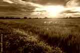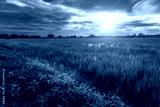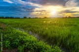 Scenic view landscape of Rice field green grass with field cornfield or in Asia country agriculture harvest with fluffy clouds blue sky sunset evening background.