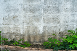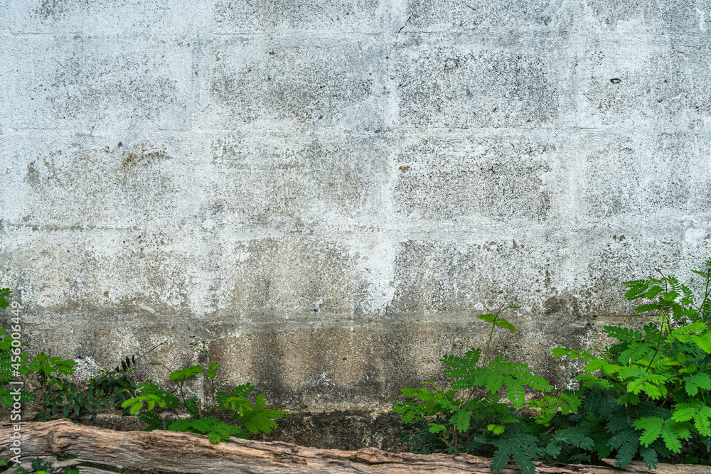 Texture of Abstract old white brick cement wall in industrial building and green grass plants background copy space