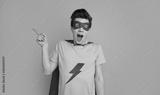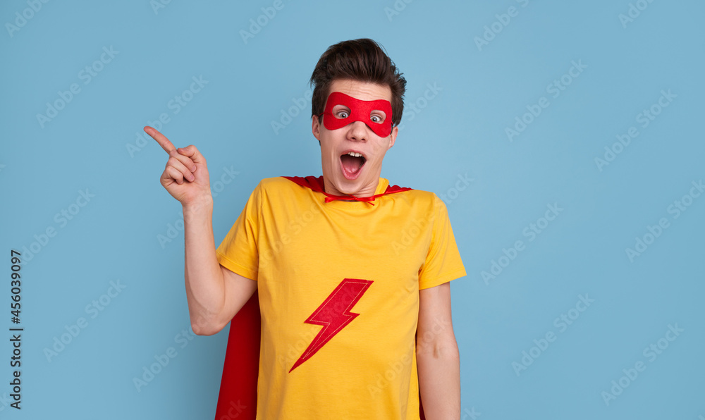 Excited superhero man pointing away