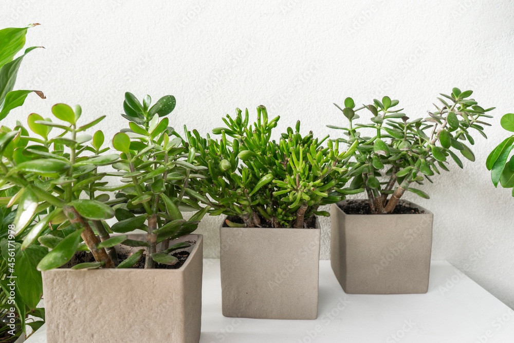 Three green succulents in concrete pots standing on a white table