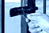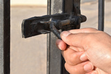Human hand locking the bolt. Steel sliding bolt lock on the gate. Selective focus. Copy space.
