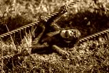 West African baby chimpanzee (Pan troglodytes verus) playing with a rope. Blurred background.