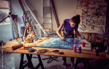 A young female artist is focused while working on a painting in the studio. Art, painting, studio