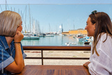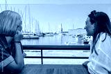Two pretty young girls gaze out over the port of Palma in a bar while waiting to be served.