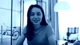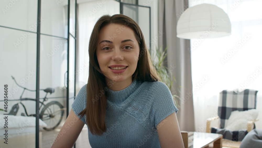young woman working at home. Girl speaking looking at camera talking making video chat or conference call. Happy female smiling