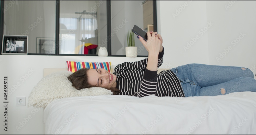 Close-up of attractive caucasian teen girl lying on bed at home and texting on her phone. Tired beautiful young woman boring at home making selfie