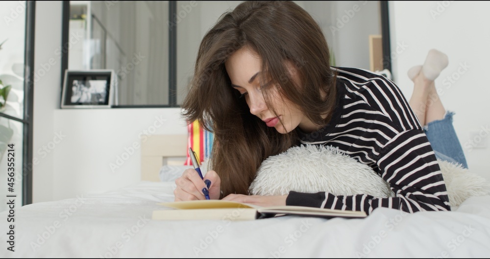 Portrait of a young happy woman making notes in notepad while lying on the bed at home