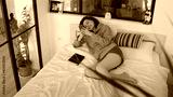 The girl is lying on the bed, texting on the phone, reading the news, sincerely very surprised . Tired beautiful young woman is bored at home. Top view