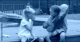 Portrait of happy sisters sitting near swimming pool