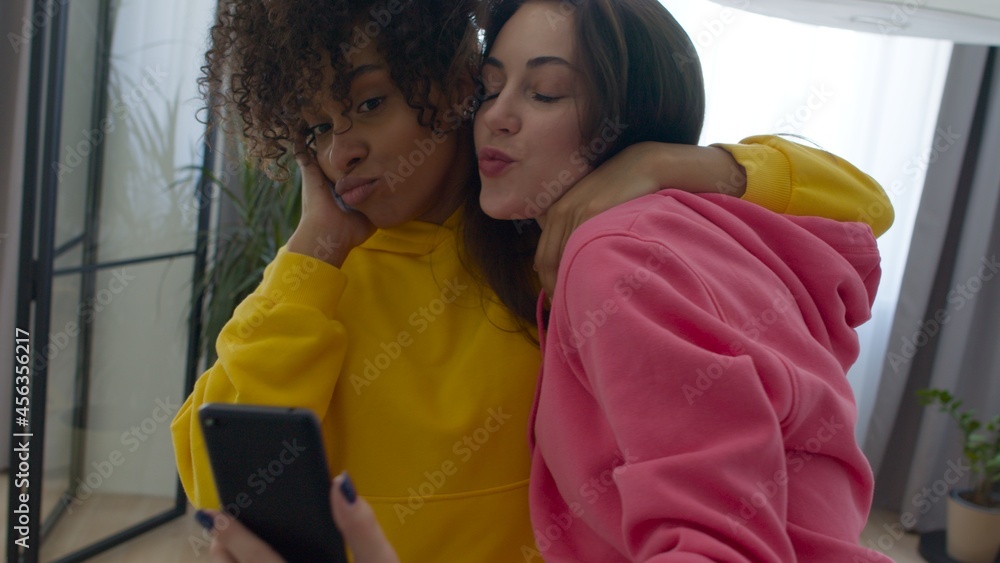 female friends fooling around at home. Black girl and caucasian young woman hugging.