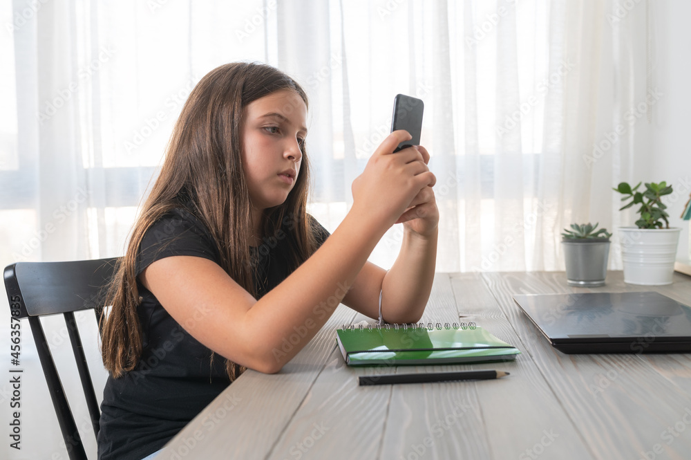 Teenage Girl Studying At Home While Watching Online Classes On Smartphone