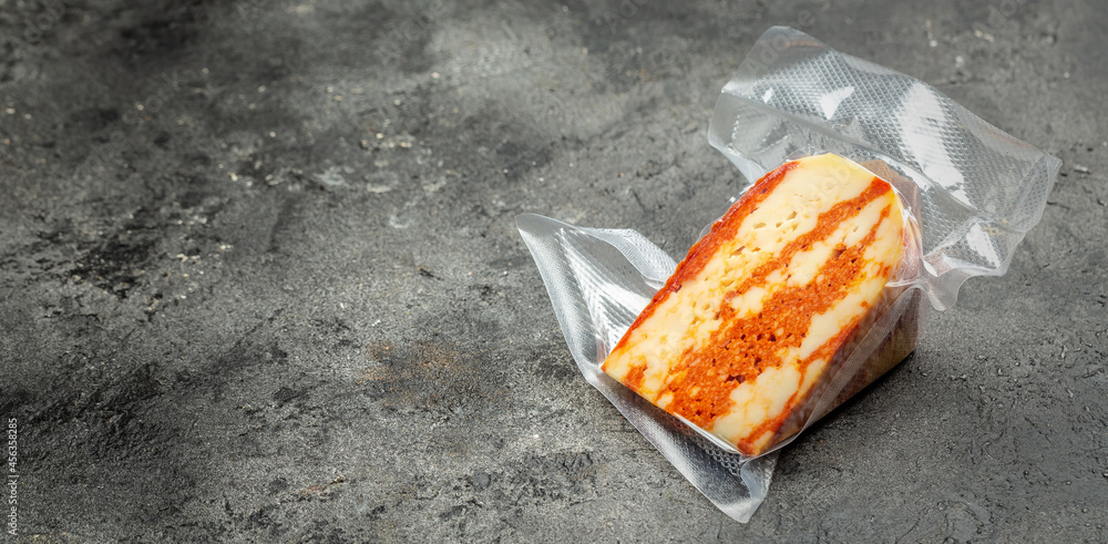 cheese shopping, a piece of marble cheese slices packaged (cheese product) vacuum packing, menu concept background. top view. copy space for text