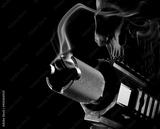 Ghost gun 3D rendering with a smoking gun up front and a dark skull behind