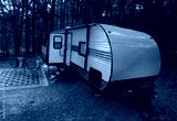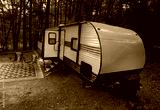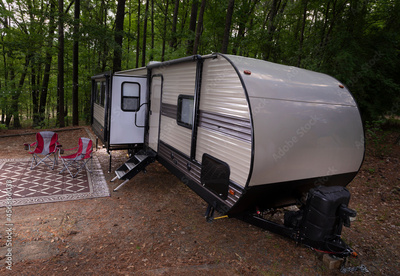Two red chairs wating at a camper trailer