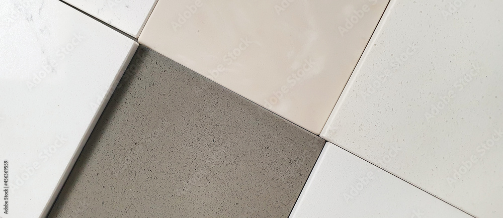 close up artificial stone samples in white, brown, beige colors tone for counter top, table top, basin or sink top finishing. artificial stone as water proof and strength material for interior works.