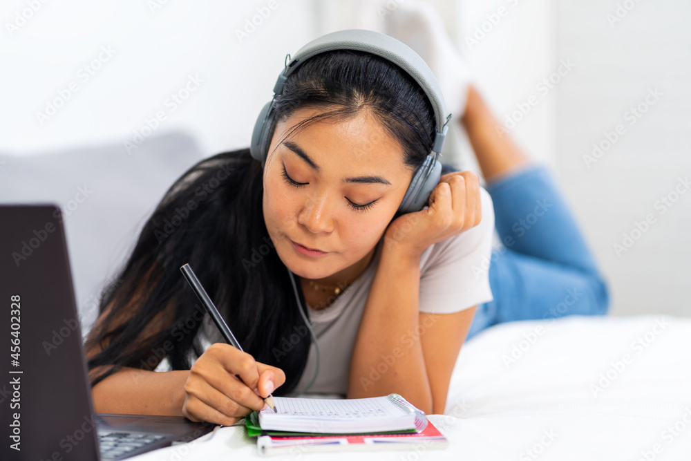 Asian student, a young woman learning the English language over the internet at home. Using headphones and a laptop computer, attending an online class