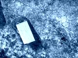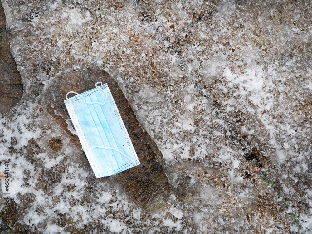 CLOSE UP: A surgical mask lies in a footprint in the slush covering sidewalk.
