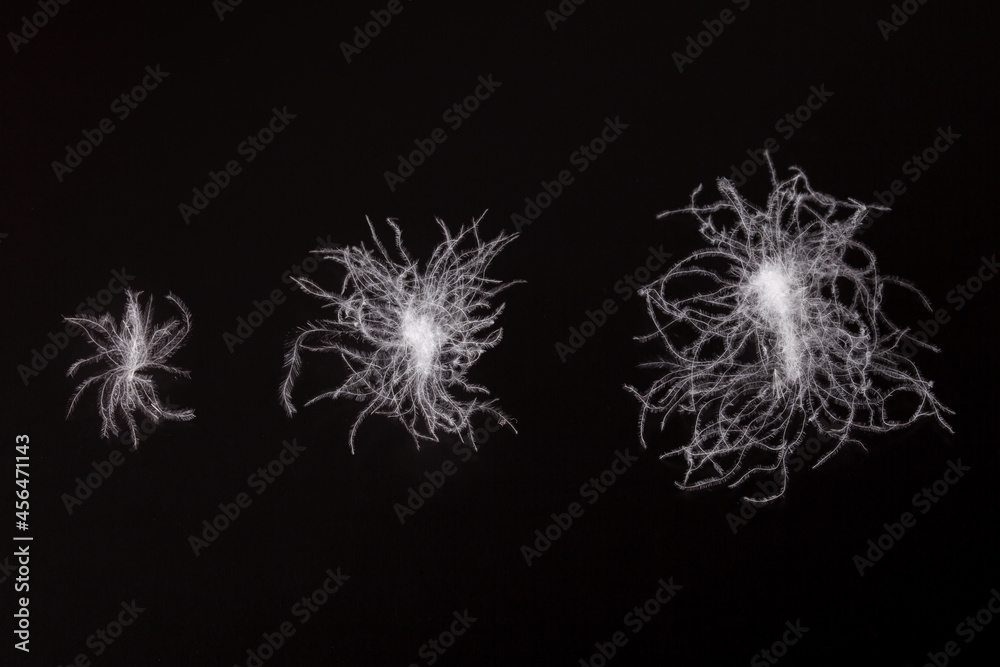 different sizes of white down feather comparison on black background.