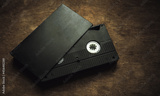 A black VHS videotape on a wooden table in a retro style. Retro recordings. Digitization of old films