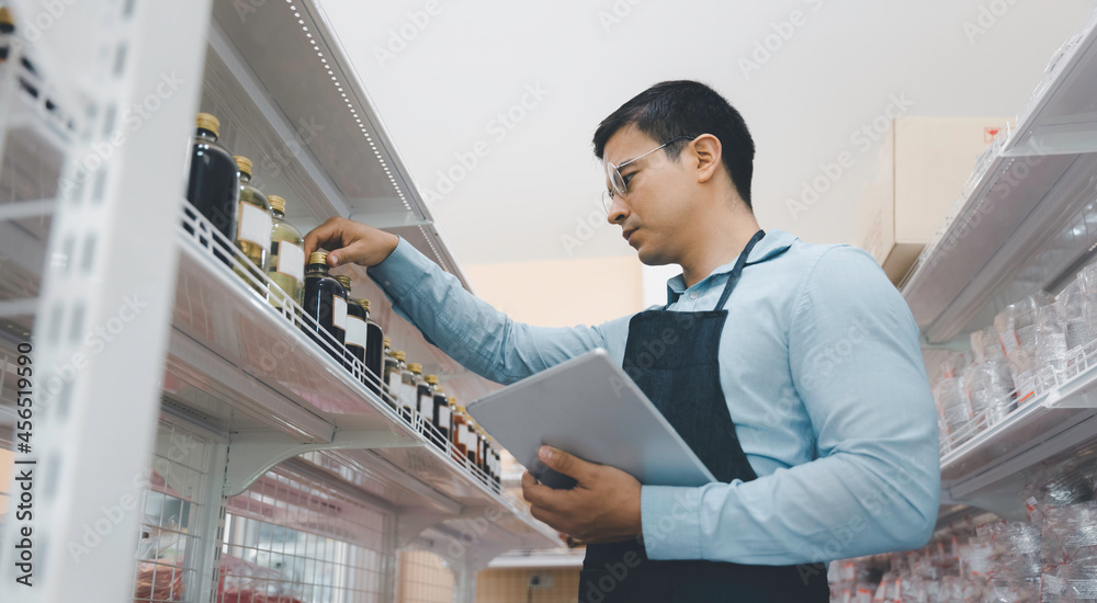 Handsome business owner or staff using computer tablet checking product inventory on shelf stock in grocery store