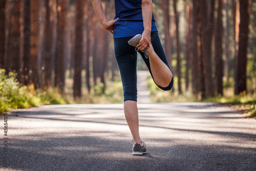 Warm up exercise before jogging. Sport training. Woman stretching before running on road in forest