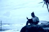 Cyfrowy nomada, człowiek pracujący z laptopem i smartfonem zdalnie na tle oceanu i skał siedzący na wybrzeżu.
