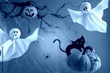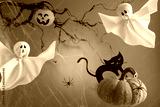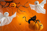 Halloween ghosts, pumpkins and black cat on orange background. Happy Halloween holiday concept. Handmade decoration for festival party.