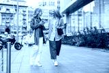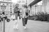 Cheerful senior woman with long haired companion walk on large city street on nice autumn day. Friends spend time together
