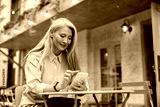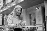 Positive grey haired senior Asian woman surfs internet with mobile phone sitting at yellow table on outdoors cafe terrace on autumn day