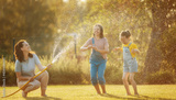 Happy family playing in backyard