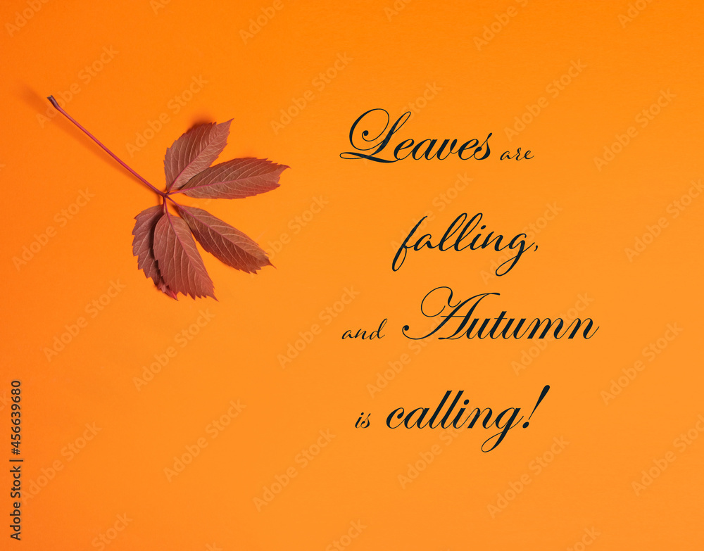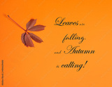 Autumn leaf falling against an orange background with the phrase Leaves are falling, and Autumn is calling