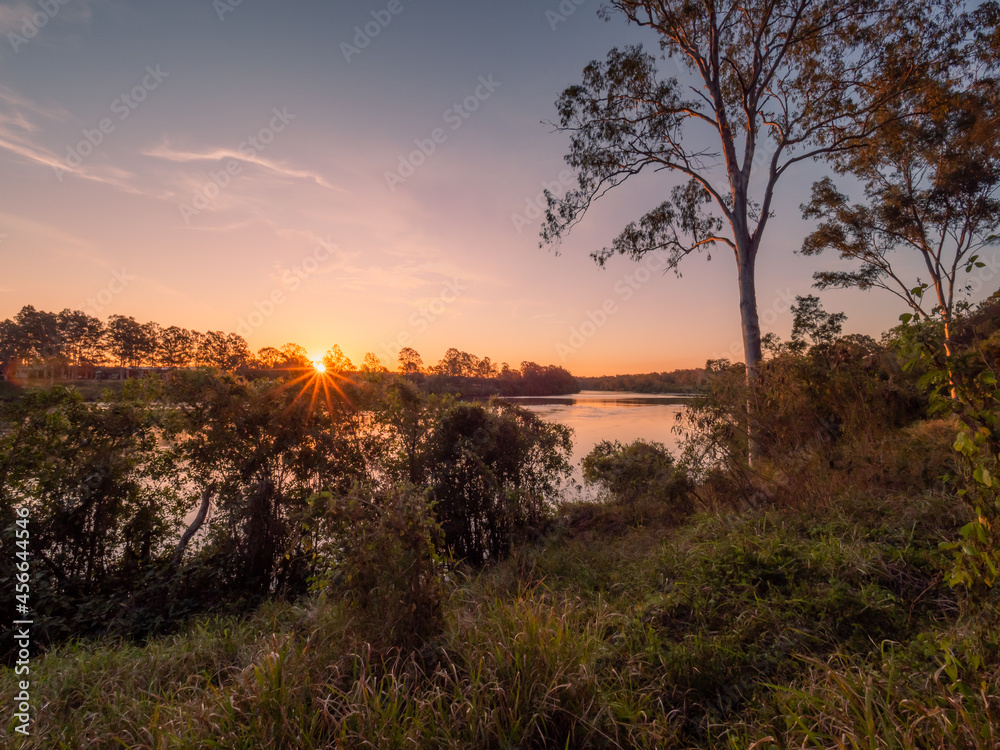 Sunset Over a River with Golden Light and Sunstar
