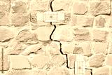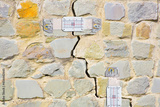 Plastic mechanical crack meter designed to measure movement across surface cracks and joints - concept with deep crack in a damaged old stone wall