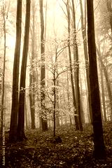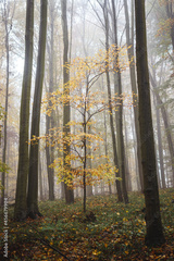 Autumn woodland. Beech tree with yellow leaves in misty forest.