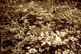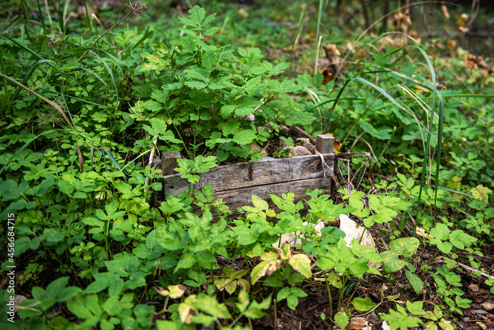 Random garbage junk items left in nature and forests. Wooden box.