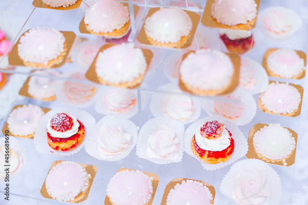 Stylish beautiful luxurious sweet candy bar on a table at a wedding ceremony in a restaurant