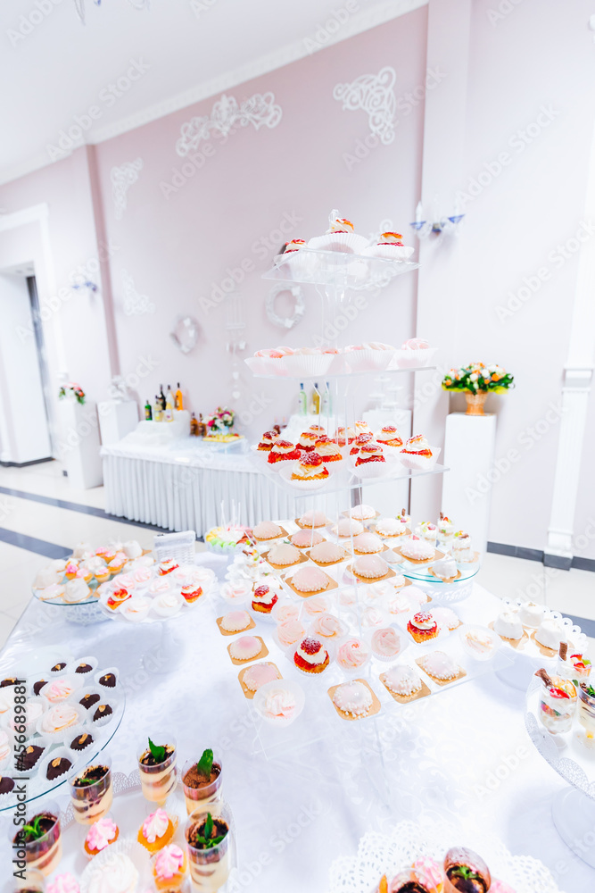 Delicious wedding buffet candy bar, dessert table. Delicious birthday party with cupcakes. Festive decor in the restaurant. Celebrating the anniversary of the date