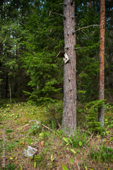 Old broken wooden bird house on tree, on a autumn day. The concept of helping the birds.