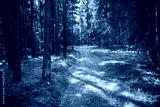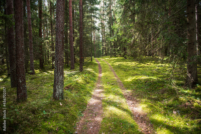 Country road in forest with pine trees and green moss.