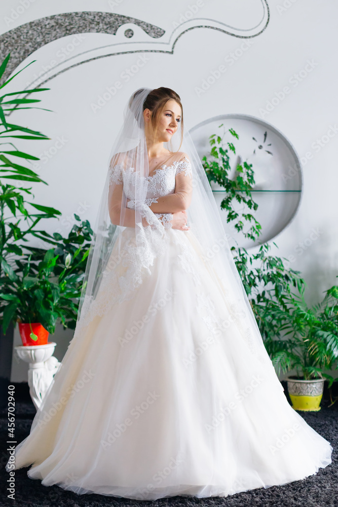A beautiful bride stands in a wedding dress with lace and a veil, waiting for a meeting with the groom