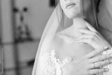 Morning of the bride. Portrait of a young beautiful tender bride with red lips in a white lace wedding dress gracefully put her hand on her neck.