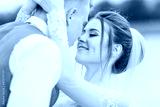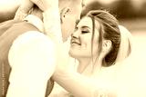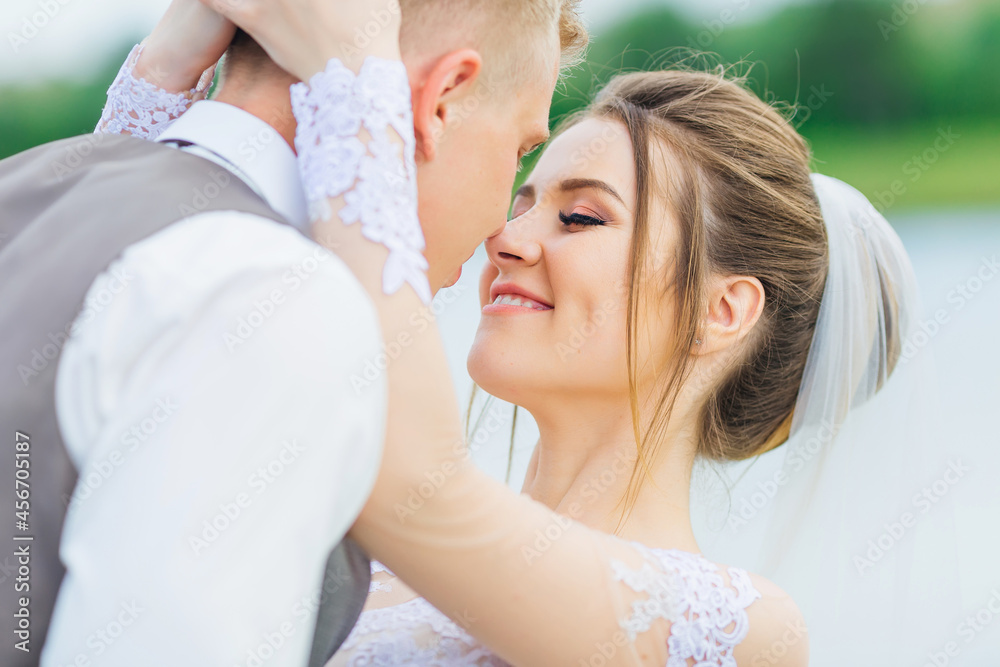 Close up portrait of smiling newlywed couple with closed eyes on green background.