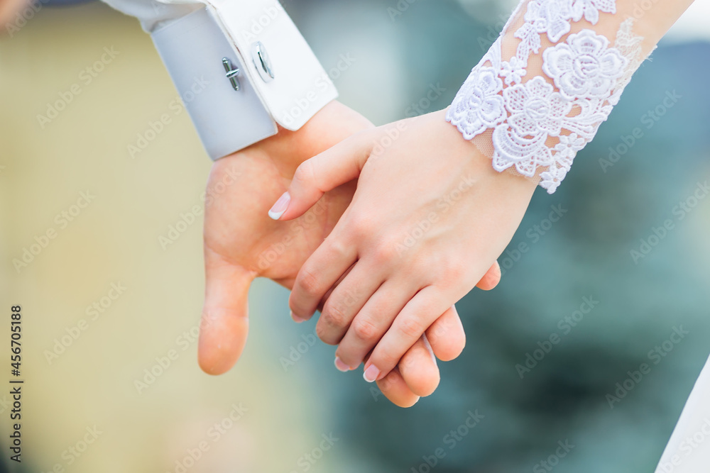 Close-up of bride hand holding that of her husband over green background
