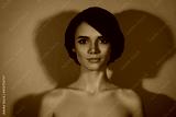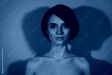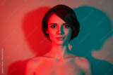 Photo of charming calm peaceful lovely bob hairdo woman look camera isolated red neon light color background