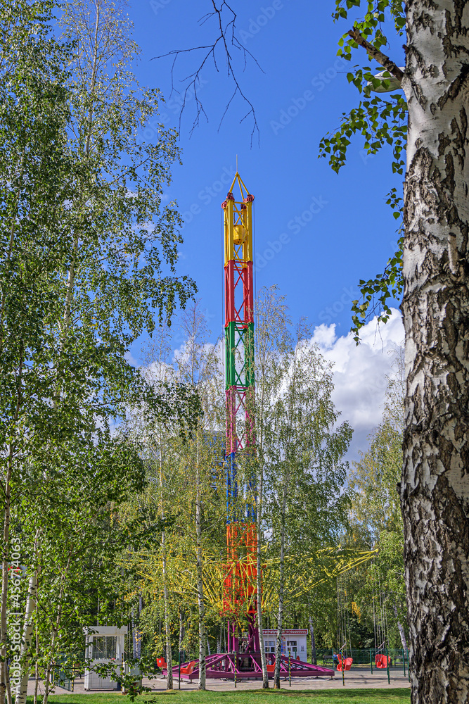 A fragment of an amusement park ride on the background of a blue sky with white clouds