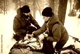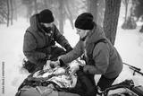 Mountain rescue service provide operation outdoors in winter in forest, injured person in stretcher.