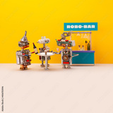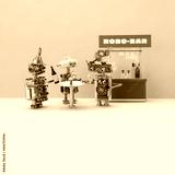 Robots are drinking wine in a bar. One of the robots shows an empty glass, offering to drink more. Copy space